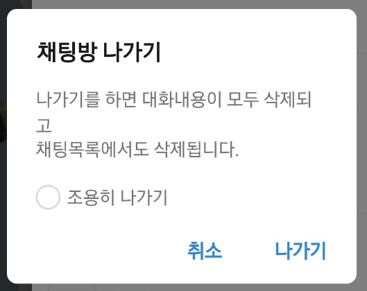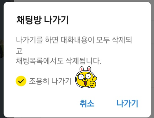 ⑤ 나가기 버튼을 클릭하면 채팅방 나가기 화면이 뜨고 [조용히 나가기]를 체크