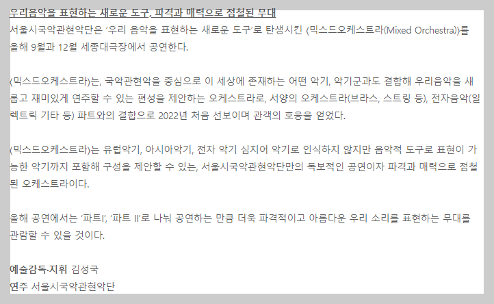 | 서울시국악관현악단 | 2023 믹스드 오케스트라 | 9.15 | 세종대극장 |