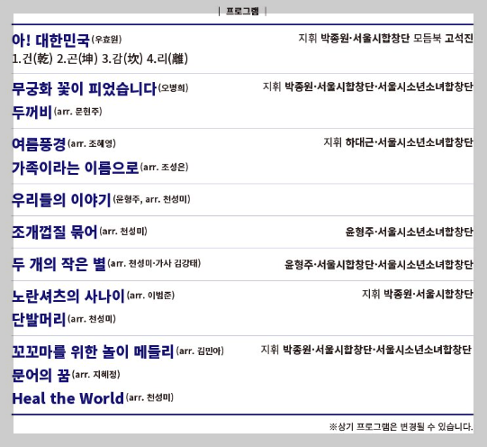 | 서울시합창단 | '여름가족음악회' | 8.31 | 세종대극장 |