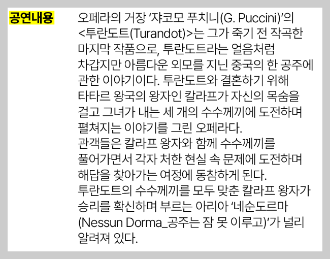 | 서울시 오페라단 | 투란도트 | 10.26 ~ 10.29 | 세종대극장 |