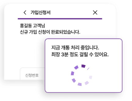 셀프개통은 신청서 작성이 완료되면 바로 개통이 진행되며 처리과정은 3분가량 소요될 수 있습니다.