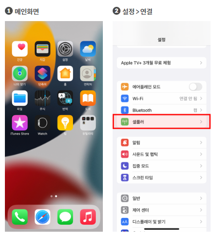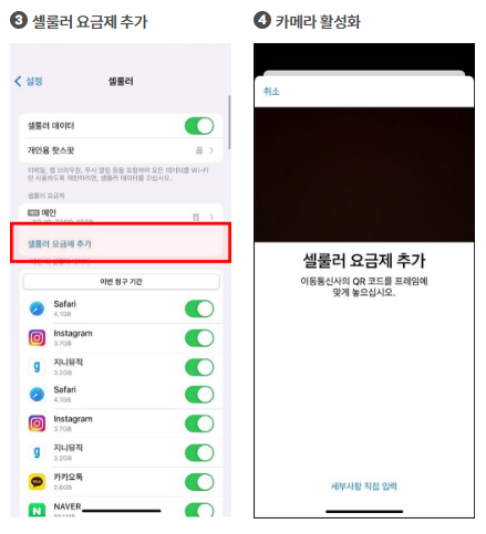 ▶ 1. 일반적 eSIM발급 순서◀메인화면설정>연결 셀룰러 요금제 추가 카메라 활성화 회선의 구분을 위한 레이블(회선이름) 설정 기본으로 사용할 데이터, 음성, 메시지 회선 선택 |