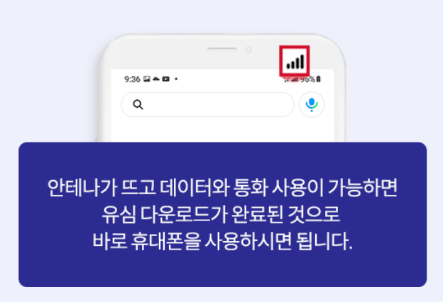 셀프개통 완료 후 휴대폰에 유심 끼운 뒤 전원을 ON, OFF를 2~3회 반복 후에 유심 다운로드가 완료된 것을 확인한 후 바로 휴대폰을 사용하실 수 있습니다. 만약 유심 인식이 안 되었다면 수동 유심 다운로드를 진행해야 합니다.
