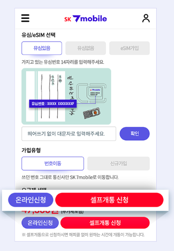 유심 준비 후 셀프개통신청서 작성